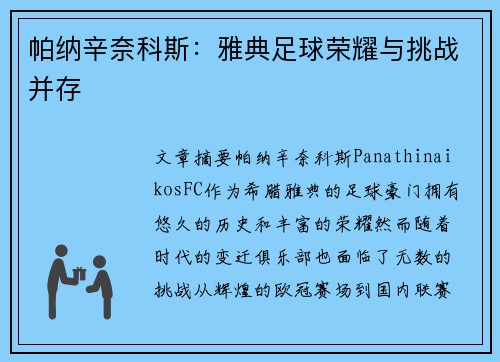 帕纳辛奈科斯:雅典足球荣耀与挑战并存